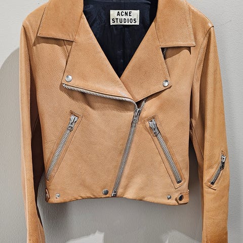 Acne Studios skinnjakke for dame i størrelse 38. Jakken er svart og laget i skinn, med klassisk krage og glidelåslukking foran. Modellen har detaljerte sømmer og justerbar kant nederst. Passer til hverdagsbruk og som ytterjakke i overgangssesonger.