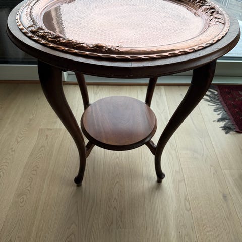 Rundt sidebord i tre med utskåret søylefot og tre buede ben. Bordet har brun lakkert overflate og en rund bordplate med dekorert mønster i treverket. Egner seg som sidebord eller lampebord i stue eller andre oppholdsrom.