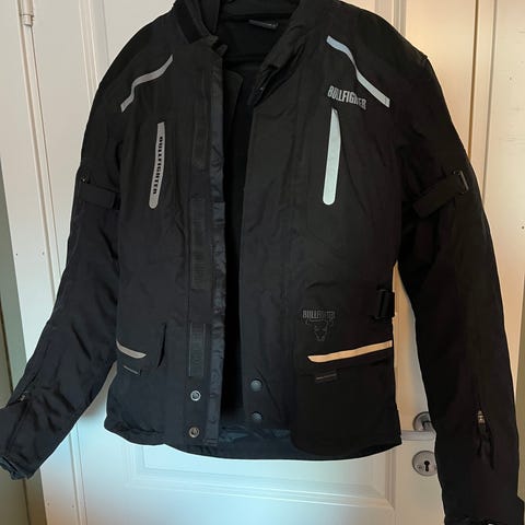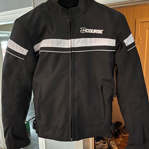 Course motorsykkeljakke og bukse i svart tekstil med hvite refleksdetaljer. Jakken har høy krage, glidelås med klaff, justeringsremmer i livet og flere lommer.