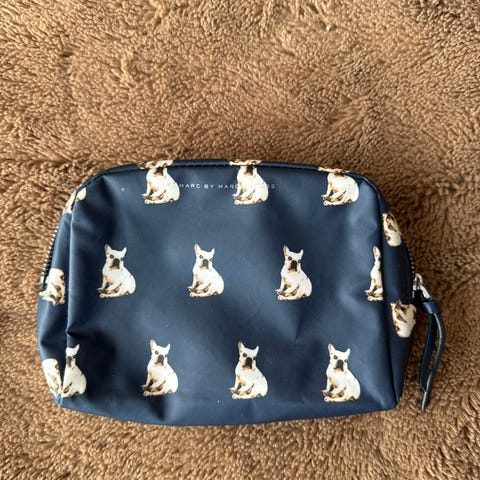 Marc Jacobs toalettmappe i svart med hvitt logomønster. Glidelåslukking på toppen og rektangulær fasong. Stoffmateriale med trykket logo over hele overflaten. Egnet til oppbevaring av toalettartikler eller småting på reise eller hjemme.