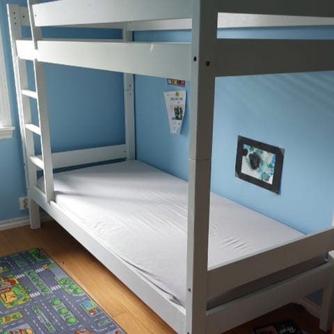 Ikea Mydal køyeseng selges mot henting og demotering. Har en del klistremerker og malingen flasser noen steder, men solid og god seng.