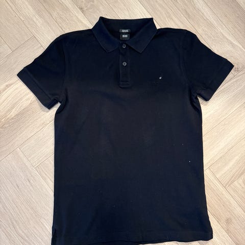Hugo Boss pique for herre i størrelse M. Plagget er svart og laget av bomull. Modellen har kort erm, krage med knappestolpe og horisontale kontraststriper over brystet. Passer til hverdagsbruk og uformelle anledninger.