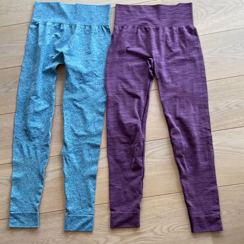 Röhnisch treningstights for dame i størrelse M. To par tights i ulike farger: ett par i grå-beige og ett par i rosa med grå detaljer. Tightsene er beregnet for trening og fitness, og er laget i et elastisk materiale som gir god bevegelighet. Passer til ulike former for innendørs og utendørs trening som styrke, kondisjon og gruppetimer.