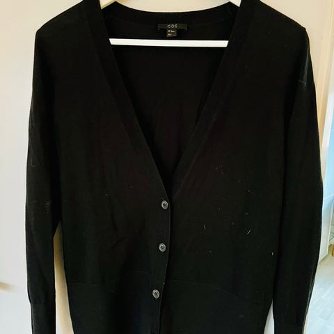 Uniqlo cardigan i størrelse XL. Cardiganen er svart og laget av bomull. Modellen har lange ermer, v-hals og knepping foran. Passer som et basisplagg til hverdagsbruk eller lag-på-lag over topper og skjorter.