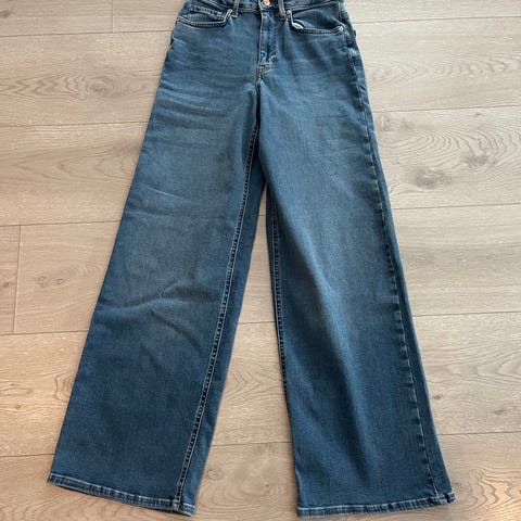 Gina Tricot Front Pocket Flare jeans for dame i størrelse 34. Buksen er i blå denim av bomull med høyt liv og utsvingte ben (flare). Modellen har frontlommer, baklommer og beltehemper i linningen. Lukkes med glidelås og knapp foran. Velegnet som hverdagsbukse.