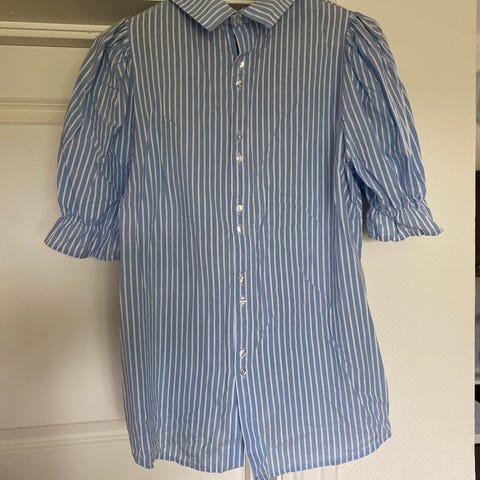 Munthe skjorte til dame i størrelse 40. Skjorten er laget av bomull og har vertikale striper i flere farger. Modellen har krage, knappelukking foran og korte til 3/4 lange ermer med lett puff og leggdetaljer. Passer til bruk både til hverdags og mer formelle anledninger, og kan kombineres med bukser eller skjørt. Selges kr 550. Kan sendes mot porto.