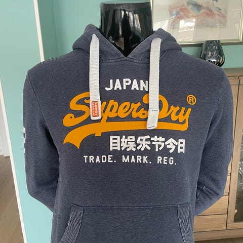 Superdry hettegenser for herre i størrelse S. Genseren er blå. Modellen har glidelås i front, justerbar hette med snøring og ribbestrikkede mansjetter og linning. Passer til hverdagsbruk og som et ekstra lag på kjølige dager.