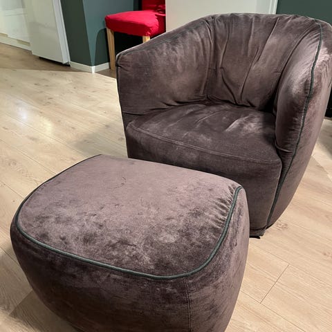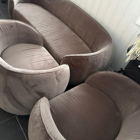 Selger en nydelig og moderne sofa + 2 matchende lenestoler i eksklusivt fløyelsstoff fra Jotex. Alt i den varme og tidløse trendfargen brun muldvarp, som gir et lunt og elegant uttrykk i stuen.