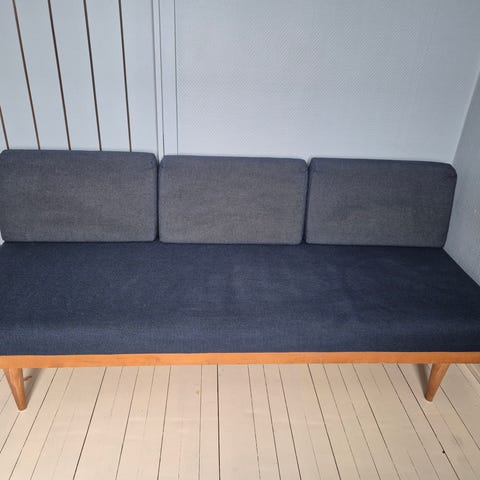 Søt men slitt retro sofa. 170/204 cm lang 74 cm dyp. Trekket er slitt og burde byttes, ellers i fin stad med pent treverk. Oppbevaring i understellet. Må hentes ila uka (før lørdag 28. februar).