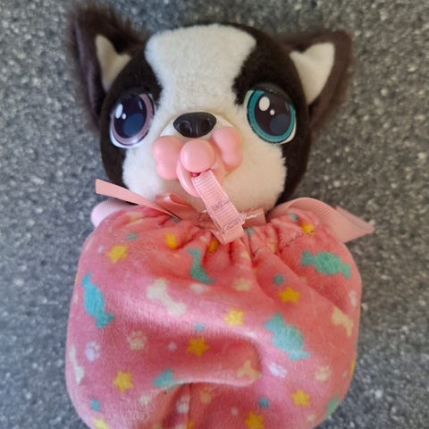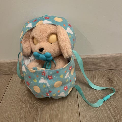 Bamse kosedyr med myk plysj og tilhørende bæreveske. Kosedyret er utformet som en lys hund med smokk. Bærevesken er blå med mønster av skyer, sol og blomster, og har skulderreim slik at barnet kan bære kosedyret med seg. Egnet som lekekamerat og til rolleleker for barn.