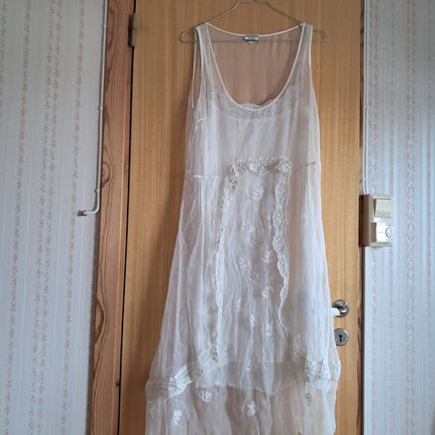 Noa Noa sommerkjole for dame i størrelse S. Kjolen er grønn og laget i viskose. Modellen har et løstsittende snitt med volangfelt og rynkedetaljer, som gir et mykt og fallende uttrykk. Erm- og halsutforming fremgår av bildene. Egnet som lett sommerkjole til hverdagsbruk eller ferie. Materiale: viskose. Farge: grønn. Størrelse: S (dame).