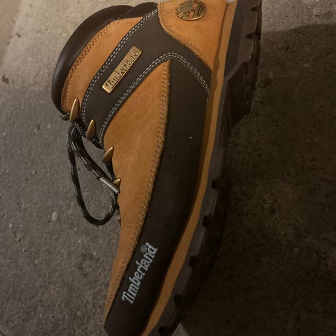 Timberland støvler i størrelse 43. Modellen er ankelhøy med snøring og gummisåle. Farge brun med kontrastfelt rundt ankel. Overdel i skinnmateriale med polstret kant for økt komfort. Passer til hverdagsbruk og fritid i variert vær.
