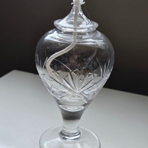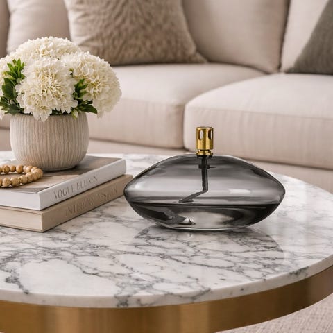 Dette er en kombinasjonsmodell som kan brukes både som en elegant liten vase eller som en nydelig oljelampe. Siden dette er et munnblåst håndverk, er hvert eksemplar unikt i form og vekt.