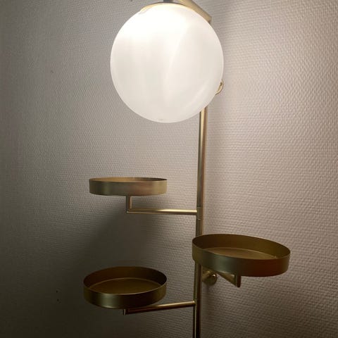Designet av Anna Landerholm for Globen Lighting. Astoria kombinerer funksjon og design, der den kan brukes i alt fra hallen, til pidestall, til sengelampe. Matte hvite brett som er justerbare og opalhvit glasskuppel. Tekstilledning med bryter.