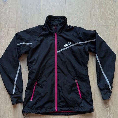 Pent brukt 2xU løpejakke i størrelse M. Sort jakke med lyngrosa striper og flere refleksdetaljer.