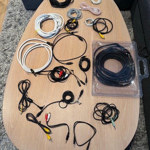 Selges samlet: diverse kabler og ladere for tele/data. Pakken inneholder et utvalg ulike kabler og adaptere, blant annet strømforsyninger, USB-kabler, nettverkskabler og andre tilkoblingskabler. Flere lengder og typer kontakter er inkludert, både hvite, svarte og noen fargede kabler. Egnet som reservedeler eller tilkobling av kompatibelt utstyr og annet elektronisk utstyr der kontaktene passet.
