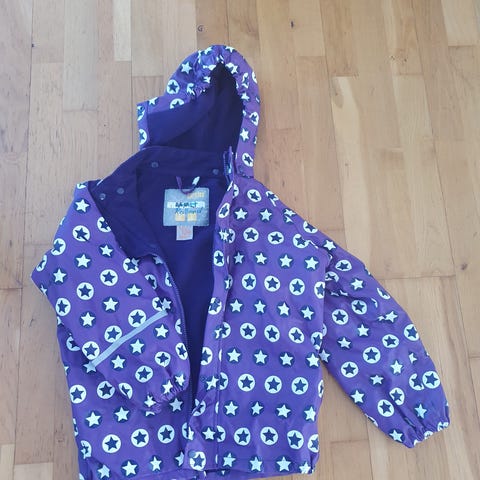 Lilla regnjakke i størrelse 10 år. Avtagbar hette. Glidelås og borrelås for enkel lukking, refleks både foran, bak, på hetta og ermene.