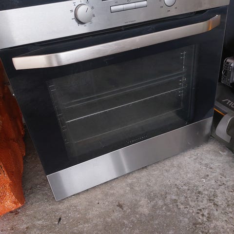 Innebygd elektrisk stekeovn med varmluftsfunksjon og vifte plassert bak i ovnsrommet. Front i rustfritt stål med stort glass i døren for innsyn. Innvendig ovnsrom med flere riller for plassering av stekebrett og rist. Standard ovnsbelysning i bakkant.
