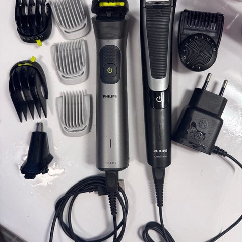 Philips OneBlade trimmer og barbermaskin med flere utskiftbare kammer og hoder. Enheten har oppladbart batteri og brukes trådløst. Settet inkluderer hovedenhet, ulike lengdekammer for skjegg og ansiktshår, ekstra barberhode, rensebørste, USB-ladekabel og oppbevaringspose. Egnet for trimming, forming og barbering av skjegg og ansiktshår.
