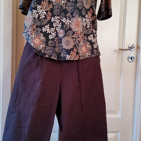 Buksen har en nydelig bomullskvalitet og avanserte sømdetaljer med f eks passepoilerte lommer i hver side og et legg, mørkebrun. Den er merket str M, men er stor i størrelsen. Det er strikk i linningen bak, og litt justerbar med noen cm med knapper i hver side i tillegg.