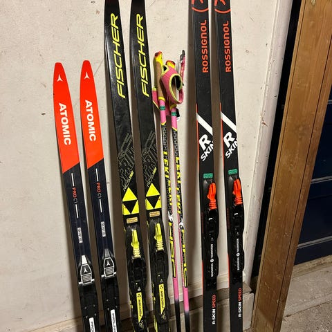 Atomic felleski på 90 cm med Alpina sko størrelse 28 til salgs. Følger også med et par Swix skistaver på 70 cm uten metallpigger.