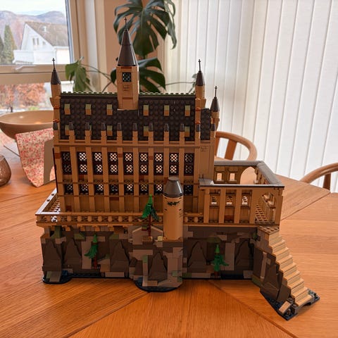 LEGO Harry Potter slottsett. Byggesett som forestiller Galtvort-slottet med tårn, murer, klipper og omkringliggende detaljer. Passer for bygging, lek og utstilling for fans av Harry Potter-universet og LEGO byggesett. Kjører ofte til Trondheim. Kan ikke garantere at den er hel hvis den skal sendes