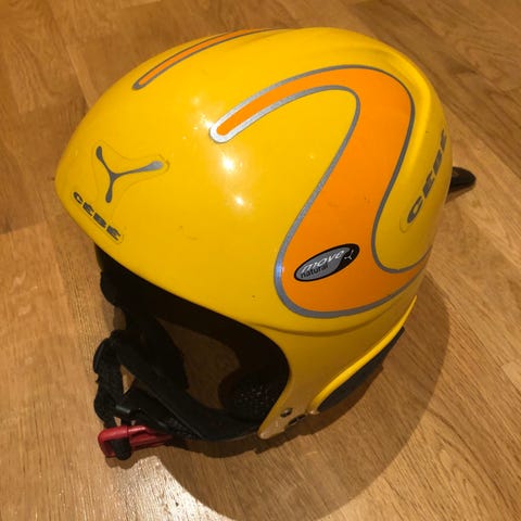 Carrera vintage racingalpinhjelm i gul med «signatur» fra The Herminator- Herman Maier.