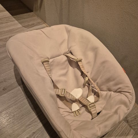 Stokke babystol til tripp trapp, 2 trekk, bøyle og sele. Pent brukt. Brukt til to barn. Nyvasket trekk og sele.