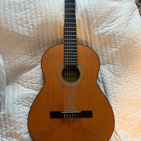 Akustisk gitar i klassisk stil med naturfarget front og rød bakside og hals. Kroppen har tradisjonell rund lydhullsrosett og seks strenger. Gitaren leveres med mykt futteral som gir enkel transport og oppbevaring. Passer til generell bruk som øving, akkompagnement og enkel spilling hjemme eller på reise.