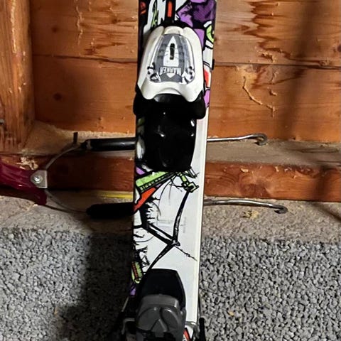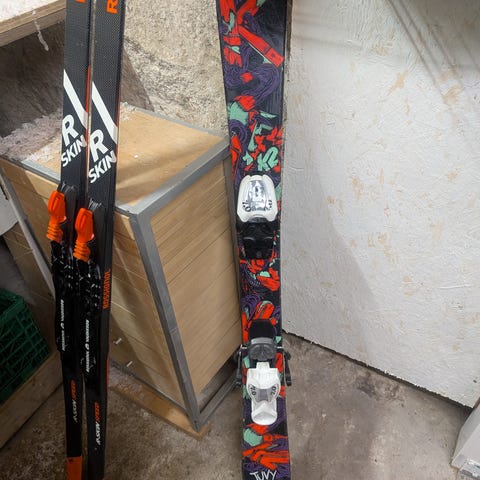 Skiene har twintip-form og er egnet til alpint/frikjøring. Overflaten har grafisk mønster i flere farger, mens sålen er sort. Bindingene er justerbare og montert på skiene. Passer til bruk i alpinbakke og park, avhengig av lengde og innstilling i forhold til bruker. Lengde, bredde og stivhet er ikke oppgitt og må eventuelt måles eller kontrolleres ved henting.