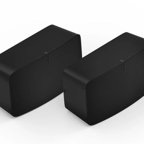 Sonos Five trådløs høyttaler i svart. Høyttaleren er laget for bruk i hjemmet og kan kobles til trådløst via Wi‑Fi i Sonos-systemet. Modellen har integrerte berøringsknapper på toppen for enkel styring av lyd og avspilling. Kabinettet er kompakt og rektangulært, og kan plasseres både horisontalt og vertikalt etter behov. Egner seg til bruk alene eller som del av et flerromsoppsett sammen med andre Sonos-enheter.