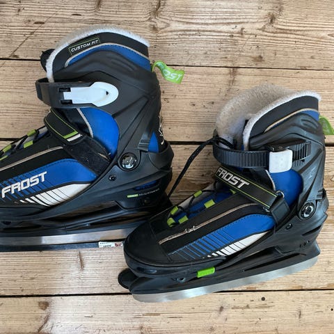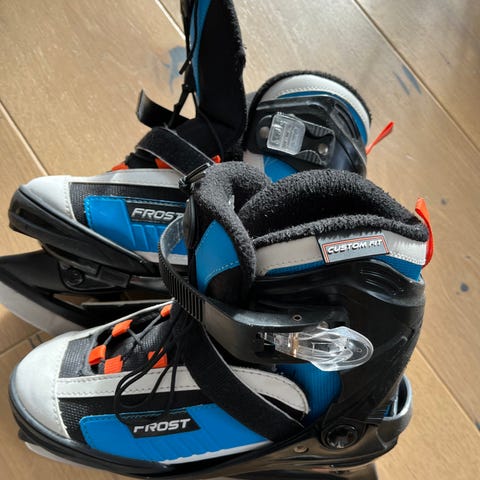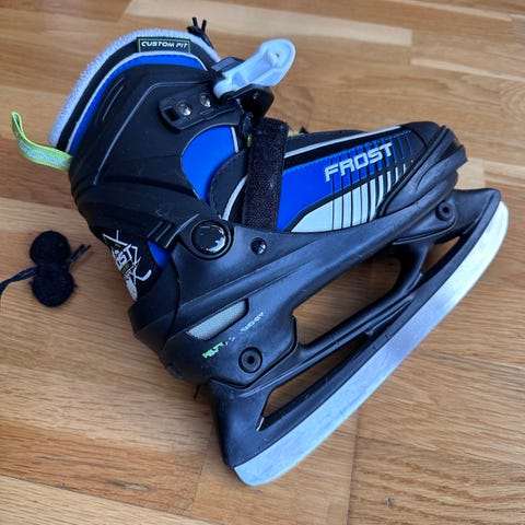 Frost Custom Fit skøyter for barn i størrelse 33-36. Modellen har justerbart plastskall med spenner og lisser for god tilpasning rundt foten. Overdelen er i syntetisk materiale i svart og blått med polstret innside for økt komfort. Skøytene har metallskinne beregnet for bruk på is, egnet til generell skøyting og lek på isbaner. Passer til barn som trenger skøyter i størrelse 36.