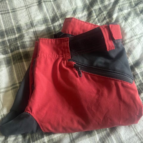 Buksen er flerfarget med hovedfarge rød og felter i mørk grått. 85% nylon og 15% elastan. Vannavstøtende. Passer som fritids- eller turbukse, med lett og funksjonelt stoff som gir god bevegelighet.