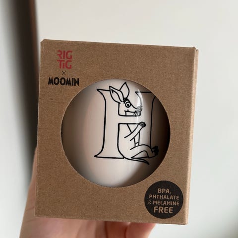 Moomin Characters barnekopp med lokk i hvit plast med turkis drikkelokk. Koppen har motiv med bokstaven S og en Mummi-figur på forsiden. Lokket har tut med tre små drikkehull og et lite luftehull på toppen. Egnet som drikkekopp for barn, for eksempel til vann, melk eller juice. Materiale og nøyaktig volum fremgår ikke av bildene, men koppen er merket Moomin Characters på undersiden.
