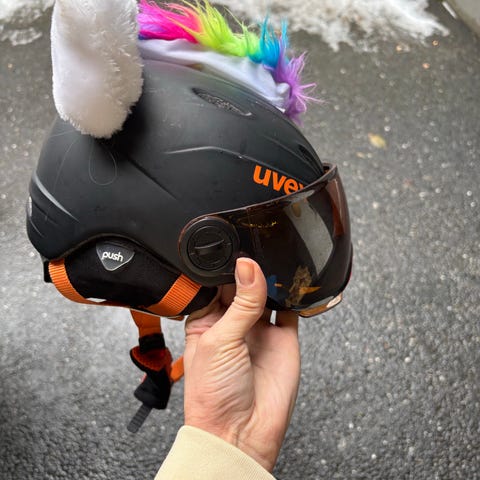Sweet hjelm til bruk i bakken eller på skøyter. Har pålimte ører som kan tas av. Brukt her fra ca 7-10 år. Har også briller som passer om det er av interesse.