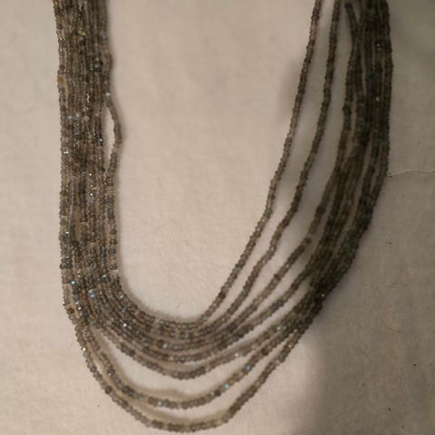 Kjede av grovslipte Labradorittsetener, lengde 50 cm.