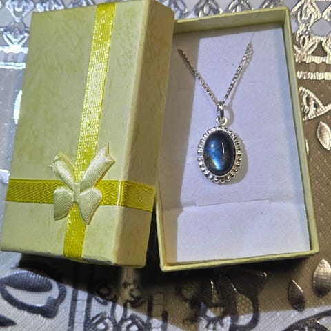 Et massivet kjede av grovslipte Labradorittstener. Lengde ca 50 cm.