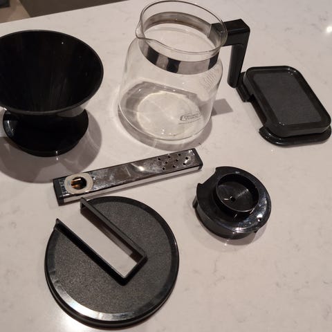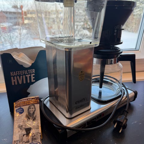 Fargekombinasjon med lys base, gjennomsiktig vannbeholder og sort filterholder/kannetopp.