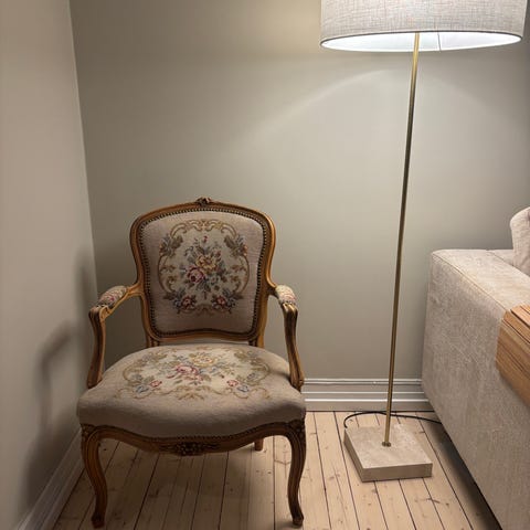 Selger en flott og dekorativ loungestol i nydelig lillafarge. Stolen har myke, avrundede former og knappdetaljer i ryggen som gir den et retro og elegant uttrykk. Stolen er god å sitte i og fremstår som pent brukt.
