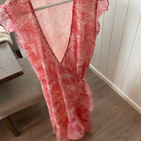 Neo Noir sommerkjole i størrelse L. Kjolen er lilla med småmønstret trykk og plissert ytterstoff. Laget i polyester med lett, transparent ytterlag og underkjole i matchende farge. Modellen har v-hals, vide ermer med volang og løs passform med rysjer nederst på skjørtet. Passer som lett sommerkjole til hverdagsbruk og enkle anledninger.