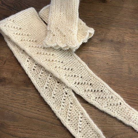 Skjerfet er strikket med originalgarnet fra oppskriften, én tråd av hver holdt sammen: