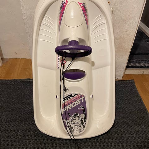 Hama akebrett med ratt i hvit og lilla plast. Akebrettet har integrert styresystem med ratt foran og fotplass på sidene. Foran er det festet en drasnor med håndtak for trekking. Egnet til lek og aking på snø for barn. Laget i hard plast som tåler bruk på vinterføre.