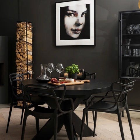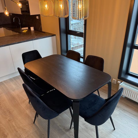 Selger en pent brukt spisegruppe består av design spisebord fra «Sixbondstreet» i brunsvart og 2 spisestoler fra «InterStil» i mørkebrun. Har noen normale bruksmerker (se bilder).