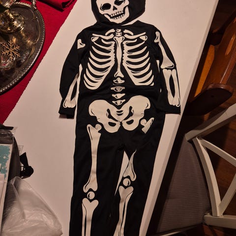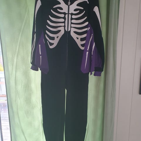 Ukjent merke skjelettkostyme unisex svart med hvitt skjelettmønster. Heldrakt med lange ermer og lange ben, samt trykk av skjelett både foran og på ermene. Passer som utkledningsdrakt til for eksempel karneval eller halloween. Materiale og størrelse er ikke oppgitt.