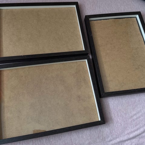 2 stk eldre bilderammer i mørk brunt tre med glass og passe partout. Strl ca 23x 29 cm. Kan sendes mot frakt og bruk av Vipps . Eller bruk fiks ferdig.