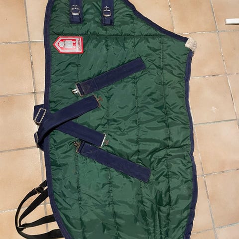 Selger to stykk blå Fairfield stalldekken til ponni/ shettis i størrelse 105 cm. Dekkenet har fyll på 150 gram. Utstyrt med flere D-ringer og justerbare stropper for feste og tilpasning. Egnet som stall- eller overgangsdekken avhengig av behov og temperatur. Materialet er syntetisk med glatt innside for å ligge godt mot hestens pels. Glatt utside forhindrer spon å feste seg.