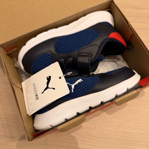 Puma joggesko for barn, jente, i størrelse 24. Skoene er i lys rosa farge med hvit såle og Puma-logo på siden. Overdelen er i tekstil og syntetisk materiale, med borrelås og elastiske lisser for enkel av- og påkledning.