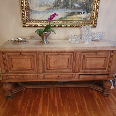 Pen, stor sjenk i lys heltre eik med 3 skuffer og 3 dører.