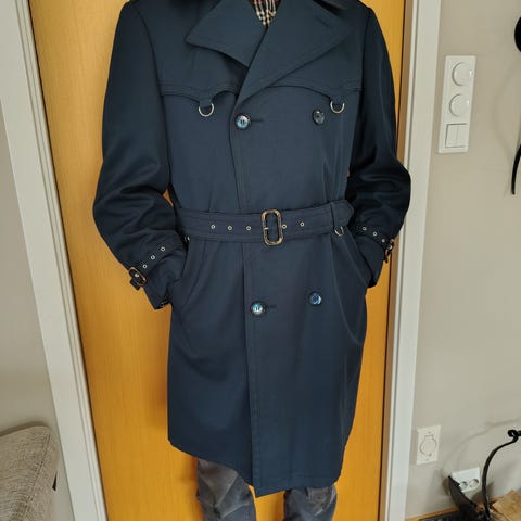 Stilig vintage frakk. Lett og foret i gråbeige farge fra svensk kvalitetsmerke. Men belte og skjulte knapper.