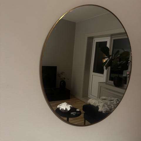 IKEA rundt speil med tynn ramme. Speilet har enkel, rund form og en smal ramme som gir et nøytralt uttrykk. Egner seg godt på vegg i gang, stue, soverom eller bad, og passer inn i ulike interiørstiler. Kan brukes både som funksjonelt speil og som veggdekorasjon.